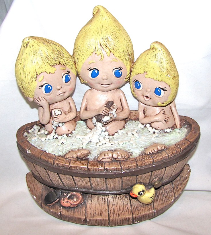 Believe it or not, this is not a homemade ceramic piece. The incised lettering on the bottom identifies this wall plaque as having been produced by an actual company, Apsit Bros. of California (and Remulak?) The Bros. must have been having an off day the day this chalkware piece was made. Either that, or the piece was intended to be marketed to an otherworldly (or outerworldly) audience.