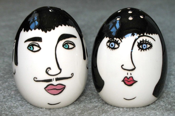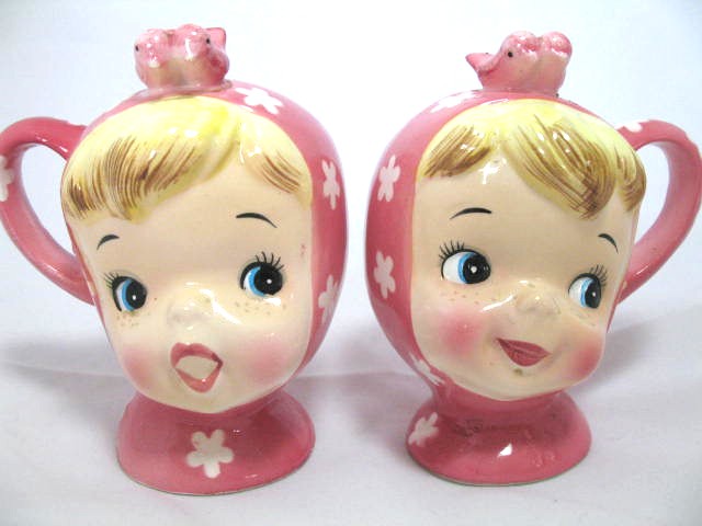 The 1950s and 1960s could be called the age of the novelty salt and pepper shaker. People collected them by the millions. I was at a yard sale in New Hampshire a few years ago and the seller must have had at least 300 sets of s&ps on the table. Most of the novelty shakers of the era were tacky, or at least they appear so now. Very few are cute, and well made. This “Miss Cutie” pair is the exception to the rule. I am still a bit sorry I sold them. I don’t keep a lot of stuff, but I think I should have found a place for them.
